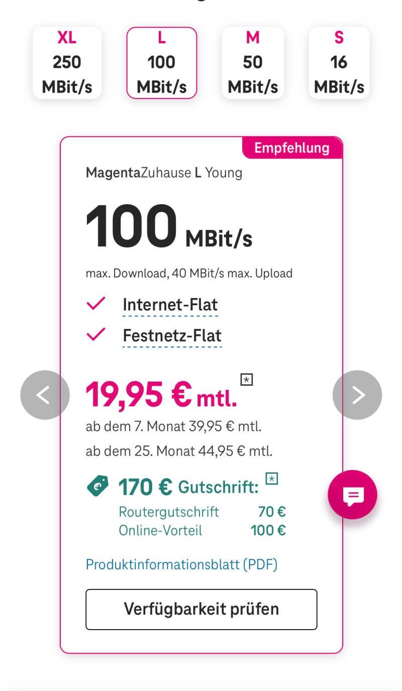 Magenta Zuhause L 100 Mbit - 170€ Bonus